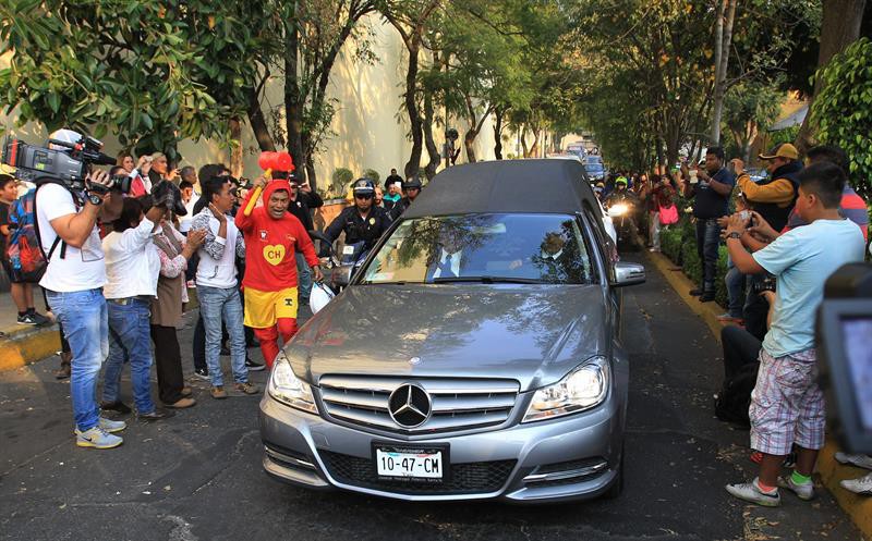Los restos del actor y guionista fueron trasladados desde su residencia en Cancún, donde falleció el viernes a los 85 años, hasta el aeropuerto donde Florinda Meza, esposa del actor y estrella de sus series, dirigió sus primeras palabras a los medios.