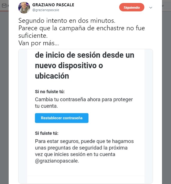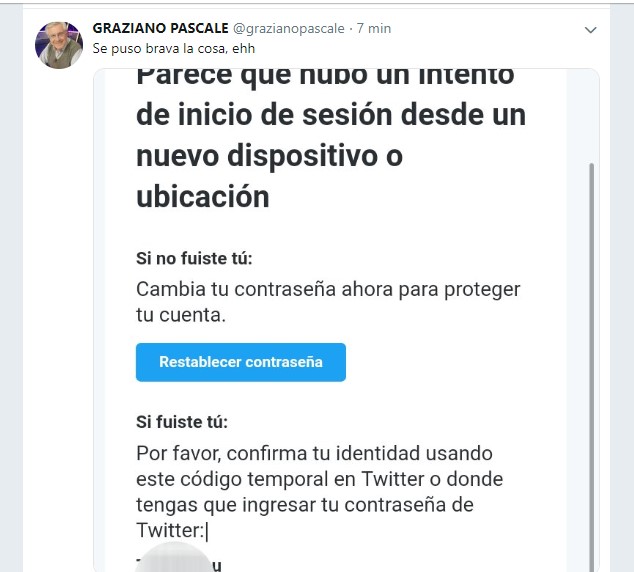 "Se puso brava la cosa", escribió en un primer tuit, al que adjuntó una captura de una notificación de Twitter que afirma que intentaron entrar a su cuenta personal. Y minutos después, acusó una nueva tentativa por lograr la intromisión.