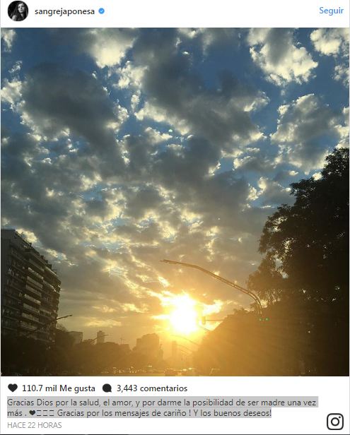 Feliz con la buena noticia, publicó unas palabras de agradecimiento en su cuenta de Instagram: "Gracias Dios por la salud, el amor, y por darme la posibilidad de ser madre una vez más. ? ¡Gracias por los mensajes de cariño! ¡Y los buenos deseos!".