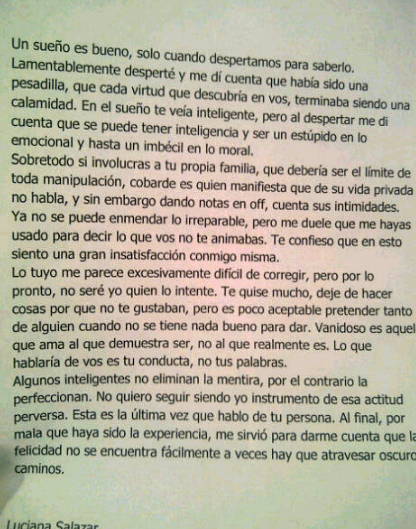 El cartero llama a los medios![]() Esta tarde se dio a conocer una carta que Luciana Salazar le habría enviado a Martín Redrado al terminar su relación. "Se puede tener inteligencia y ser un estúpido en lo emocional y hasta un imbécil en lo moral", afirma la rubia. La noticia de la ruptura de esta relación apenas confirmada públicamente hace semanas, llegó de parte de la blonda más temprano en la jornada. "Amigos, quería decirles que estoy totalmente desilusionada. Me acabo de enterar de una gran mentira que me partió el alma", escribió en su Twitter, según cuenta Perfil. "Una persona perversa. Es un día muy triste pero decido ponerle fin a esta relación con @martinredrado porque me desilusionó como hombre y ser humano", dijo sobre el ex presidente del Banco Central argentino. El 11 de febrero, ante las presiones y la aparición de fotografías, Salazar y Redrado habían reconocido el romance que los unía. Horas más tarde, se conoció la noticia de que la joven vedette fue internada por una crisis nerviosa en el Sanatorio Otamendi. El ex funcionario dijo al respecto "Es un tema menor, nunca hablé ni nunca repliqué sobre temas de mi vida privada, tengo una conducta y la seguiré manteniendo, voy a seguir sin contestar". Algunas versiones indicaban que la crisis de Salazar estalló tras la negativa de su flamante novio de contar y retratar su historia de amor en una importante revista que les aseguraba la tapa. PrimiciasYa difundió los primeros datos. La revista Para Ti publicó una nota a Salazar, donde ella menciona que quiere conocer a los hijos de Redrado, así como formar una familia con él. Cuando regresó de Estados Unidos, Redrado leyó la nota y no le gustó nada. Le escribió un mail a la rubia para contarle sus sentimientos. Creía que ella iba muy rápido y que tenían objetivos distintos en estos momentos, ya que acaba de separarse. Confesó que no estaba listo para formalizar ni convertirse en padre nuevamente. Ante los rumores de que ella intentó quitarse la vida y que por ello fue internada, ella aclaró en Twitter que "jamás intenté suicidarme ni tomé pastillas, fui al Otamendi porque no me sentía bien y yo soy anémica y perdí peso". |