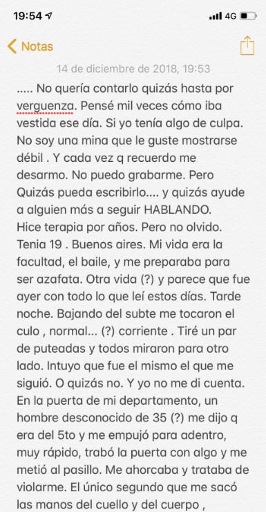 "Bajando del subte me tocaron el culo, normal, corriente. Tiré un par de puteadas y todos miraron para otro lado. Intuyo que fue el mismo el que me siguió", continúa en la estremecedora descripción.