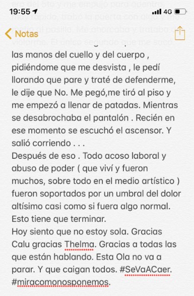 Finalmente, la bailarina agradeció a Calu Rivero y Thelma Fardín, quienes en los últimos días lideraron un movimiento de denuncias de abusos sexuales que ocurrieron en el mundo del espectáculo, que derivó en un masivo sistema de denuncias en redes sociales.