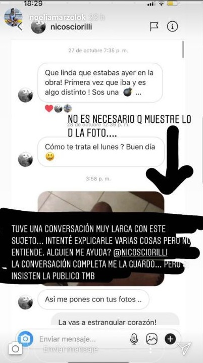 Al recibir esto, la actriz lo escrachó en sus historias:"Tuve una conversación muy larga con este sujeto... Intenté explicarle varias cosas, pero entiende. ¿Alguien me ayuda? la conversación completa me la guardo. Pero si insiste la publico también".