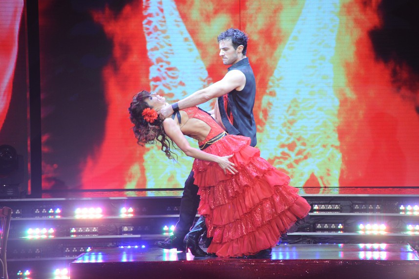 Laura Fidalgo y Pablo Juin fueron la tercera pareja de la noche y bailaron el tema de Bebe, Malo eres. Lookeada con un imponente vestido de bailaora rojo y negro, Laura invitó a un grupo de bailaoras de flamenco de su escuela, que habían ido a apoyarla y bailaron alrededor del conductor, tocando las castañuelas.