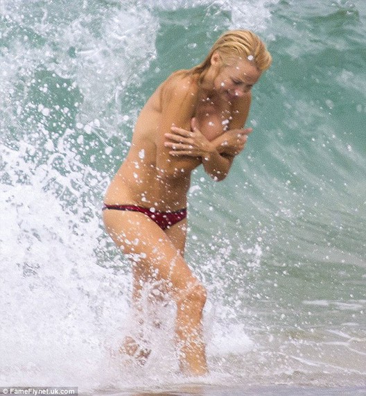 La actriz mostró estar espléndida a sus 45 años, y disfrutó del agua y de la arena con un pequeño bikini rojo, y nada más. Arriba no usó nada, pero cuidó su topless con sus manos, evitando que se viera cualquier pedacito de piel.