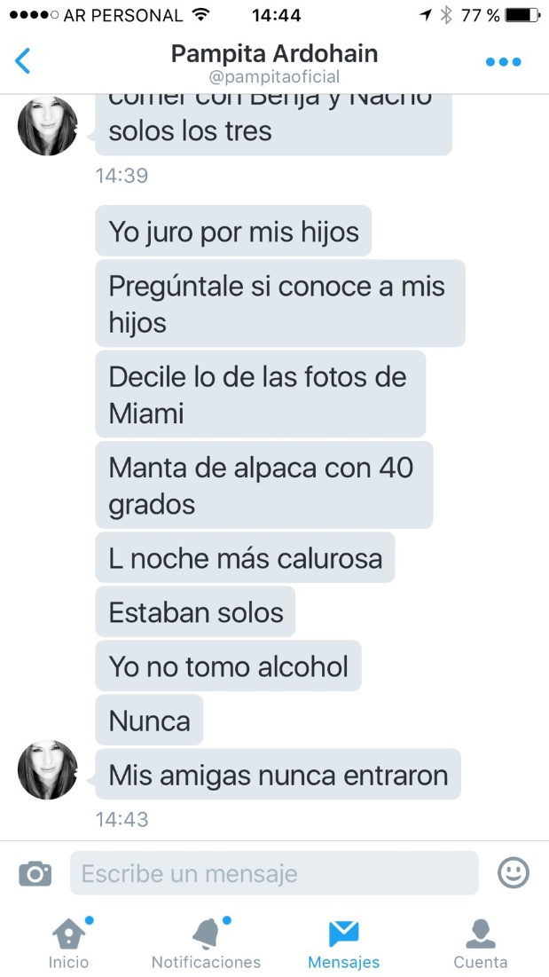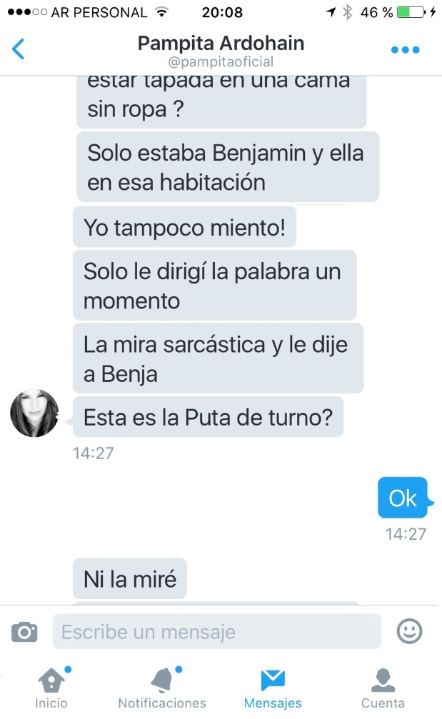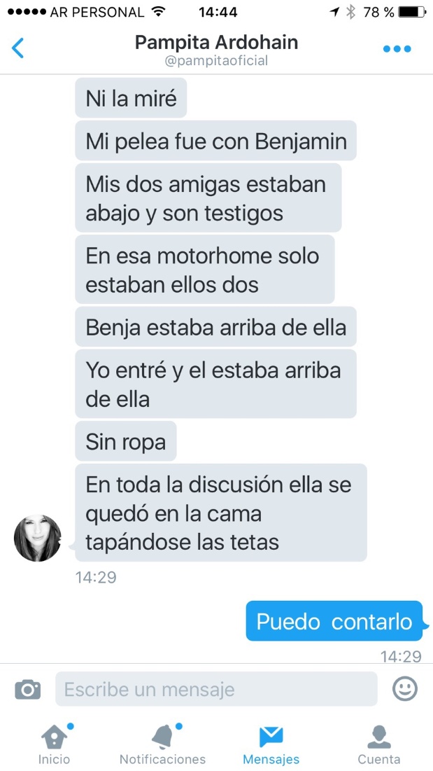 Pampita contradijo la versión de la China. "Solo estaba Benjamín y ella en la habitación. Solo le dirigí la palabra un momento. La miré sarcástica y le dije a Benja. ¿Esta es la put... de turno?", aseguró.