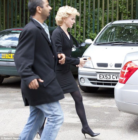 En un impecable tailleur negro, con medias y zapatos al tono, con el habitual peinado de Lady Di y un sobrio maquillaje, fue fotografiada por los paparazzi en el set.