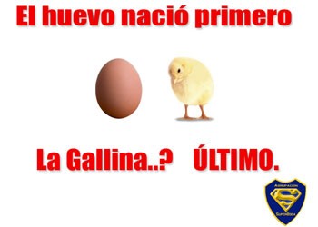 El afiche dice: "El huevo nació primero, La Gallina...? último", y está ilustrado con un simpático polluelo.