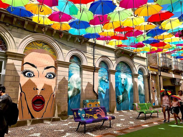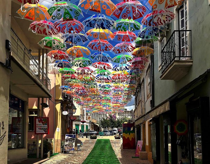 La avenida Luís de Camões, la calle más comercial de la ciudad, es el mejor ejemplo de decoración con paraguas, que se extienden también por otras zonas turísticas de la ciudad.