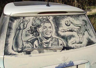 Scott Wade es un artista que, desde hace años, se especializa en realizar sus trabajos en los cristales sucios de los automóviles. El portal de Globo señala que el plástico, en lugar de escribir las frases típicas que todos alguna vez escribimos en los vidrios de autos y ómnibus, hace uso de su talento para crear obras un tanto perecederas.Es así que, el mes que viene, en el Festival de Arte de Atlanta, en Estados Unidos, el talentoso artista expondrá algunos de sus trabajos más logrados. Entre ellos puede verse un retrato de Ronaldinho Gaucho, una familia completa gritando desde el interior del vehículo, y una réplica de la Mona Lisa de Leonardo.
