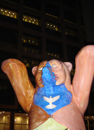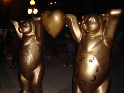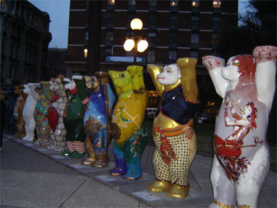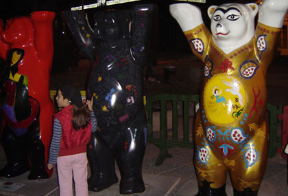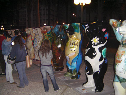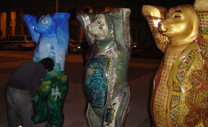 Los osos, de dos metros de altura, fueron instalados en la Plaza de la Independencia, y el ataque fue realizado poco antes de que la muestra sea inaugurada por el presidente Tabaré Vázquez, el intendente Ricardo Ehrilich, y el embajador de Alemania en Uruguay, Bernhard Graf von Waldersee.Cada uno de los osos está pintado con figuras, personalidades, paisajes y colores representativos de los países que integran la muestra.
