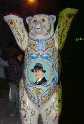 El oso argentino incluye una amplia imagen del cantante de tangos Carlos Gardel, cuya nacionalidad es una disputa de años entre argentinos y uruguayos.