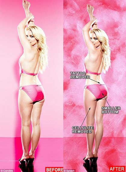 La cantante Britney Spears, particularmente en las épocas en que estaba más excedida de peso, se benefició a menudo de las bondades digitales. Sin embargo, Britney aceptó esta vez que se dieran a conocer algunas fotos que le tomaron sin ningún retoque, con el objetivo de compararlas con las versiones que salieron luego publicadas.