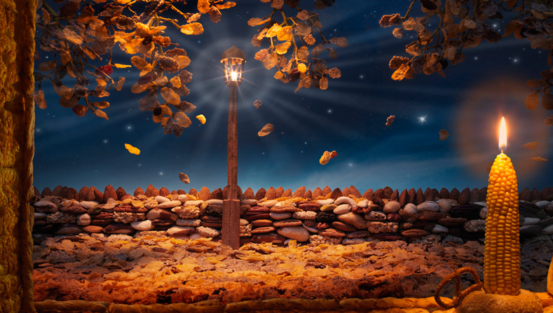 Los compró y los llevó a su estudio. Los mezcló con algunos otros productos como arroz, semillas y granos y creó una increíble decoración miniatura encima de la mesa.