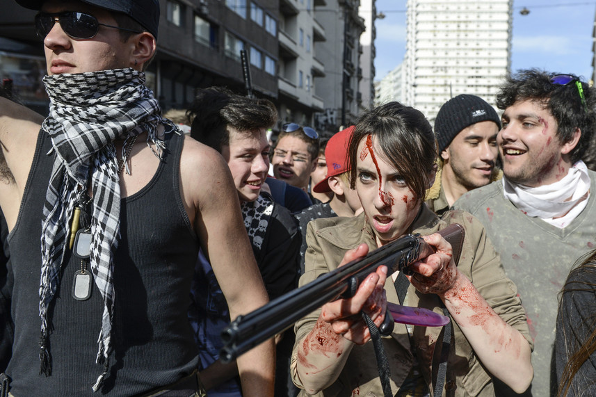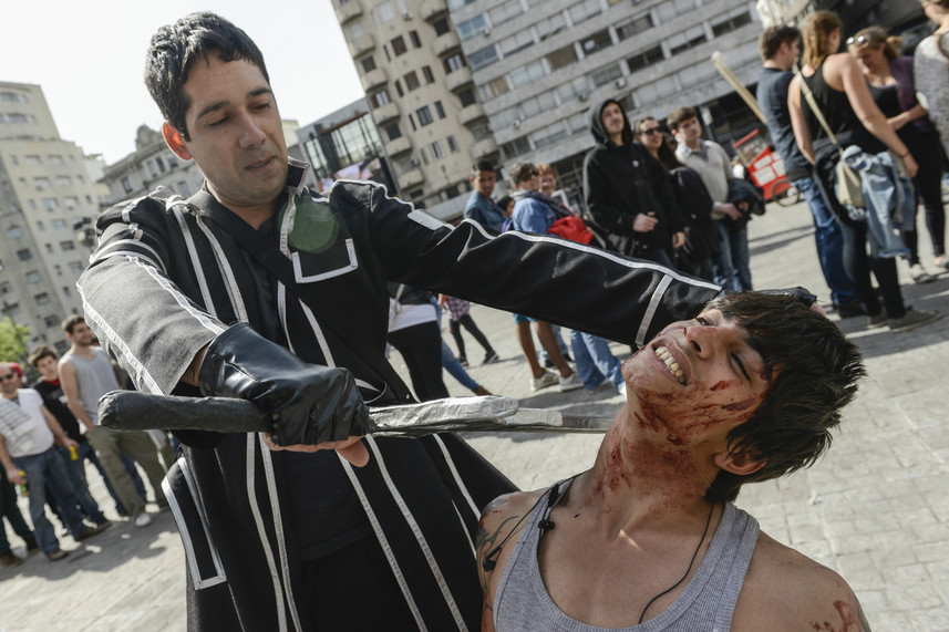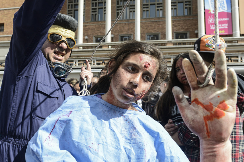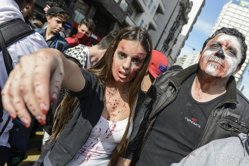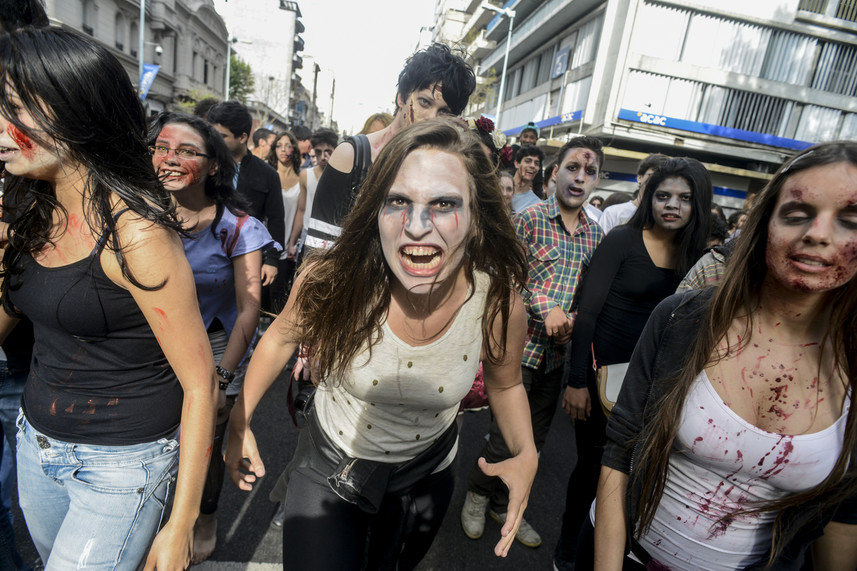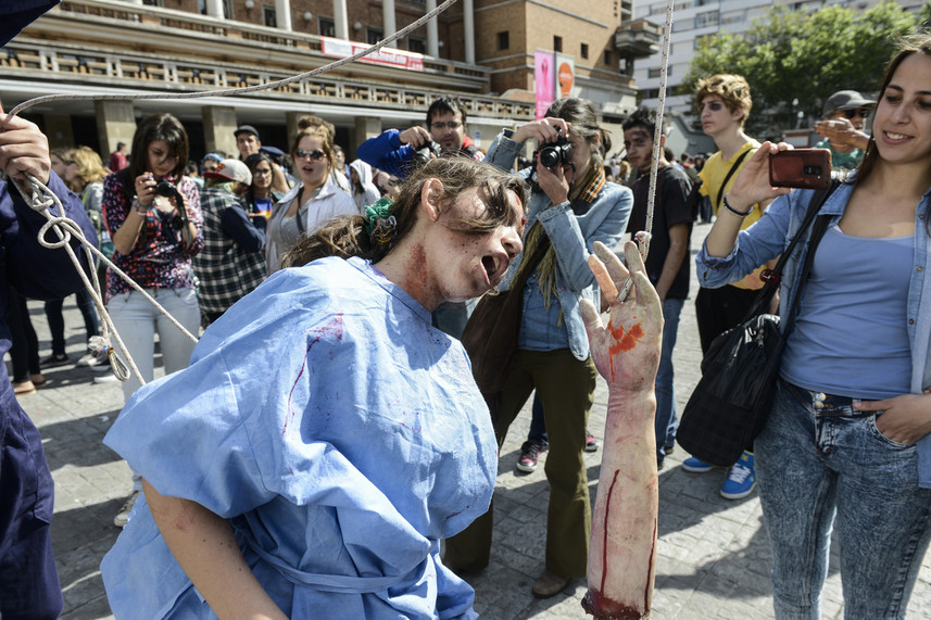De esta manera, pasadas las 15:00 h, cientos de personas de todas las edades invadieron la principal avenida de Montevideo lookeados como muertos vivientes: ensagrentados, con tajos, con pronunciadas heridas y con la ropa rota.