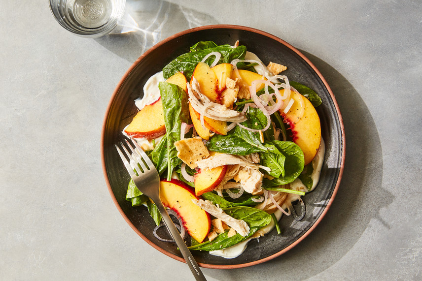 — Macera los echalotes y las nectarinas en jugo de limón amarillo, luego mezcla con espinaca, pollo desmenuzado y totopos de pan pita. Consúmela con aderezo de queso de cabra y suero de leche. (Ver la receta).