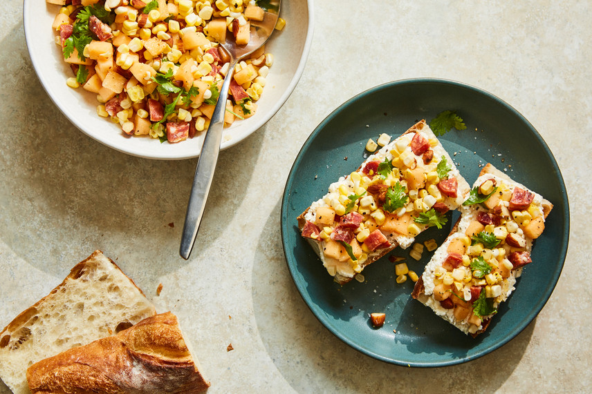 El melón fresco y el elote son las estrellas de estos panes tostados que son una comida completa. Se mezclan con salami picante para complementar su dulzor. Puedes usar cualquier carne curada intensa como salami de pimienta negra, chorizo español en cubos o un salami curado italiano. El queso ricota de leche entera, que se hace más cremoso con la “leche” que queda al desgranar los elotes, se unta en el pan crujiente y luego se añade encima la ensalada de melón, elote, salami, más almendras y cilantro. Juega con el equilibrio entre dulce, picante, jugoso y crujiente añadiendo chile fresco, pepinos en rebanadas delgadas y chícharos japoneses, o sustituyendo el melón por frutas con hueso.
