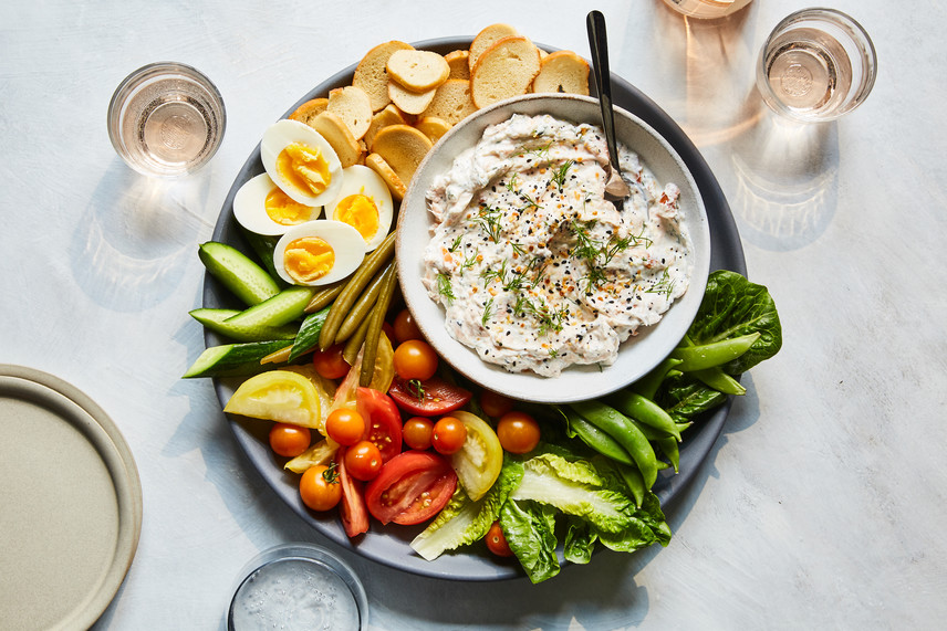 — Sirve el aderezo de salmón ahumado con pepinos, tomates, totopos de bagel y verduras en escabeche. (Ver receta).