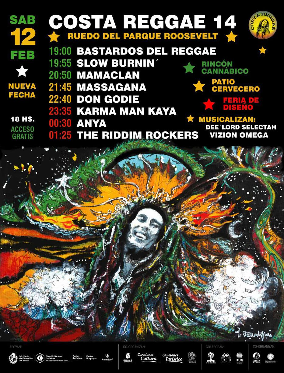 El sábado 12, el ruedo del parque Roosevelt se viste de rojo, amarillo y verde para recibir el Costa Reggae 14, empezando a las 19:00 horas de la mano de Bastardos del Reggae y cerrando la noche con The Riddim Rockers a la 01:25 del domingo.