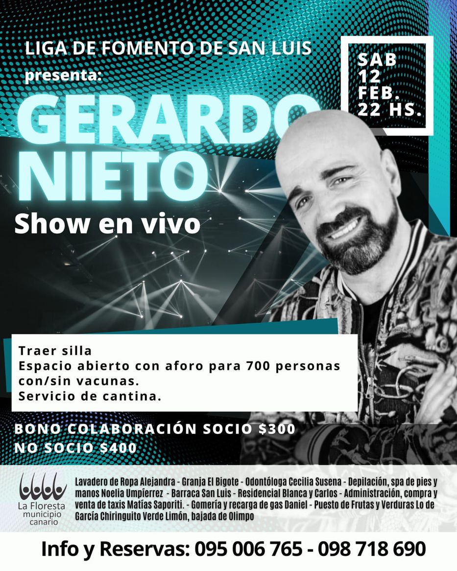 A las 22 horas del sábado, en la Liga de Fomento de San Luis, Gerardo Nieto presenta su show en vivo, con entradas para socios a 300 pesos y para no socios a 400.