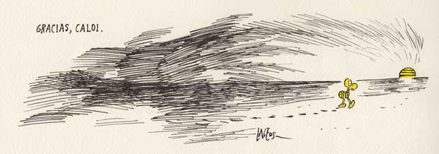 La contratapa de Clarín tuvo a Altuna, Sendra, Crist y Tabaré despidiendo al humorista. "Para el Negro Caloi y su exquisita alma de dibujante", escribió Sendra, el autor de "Yo Matías".