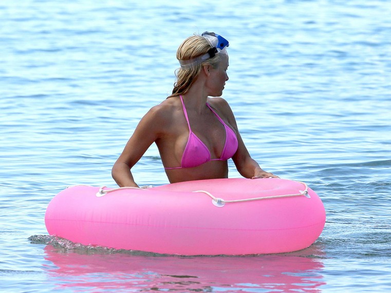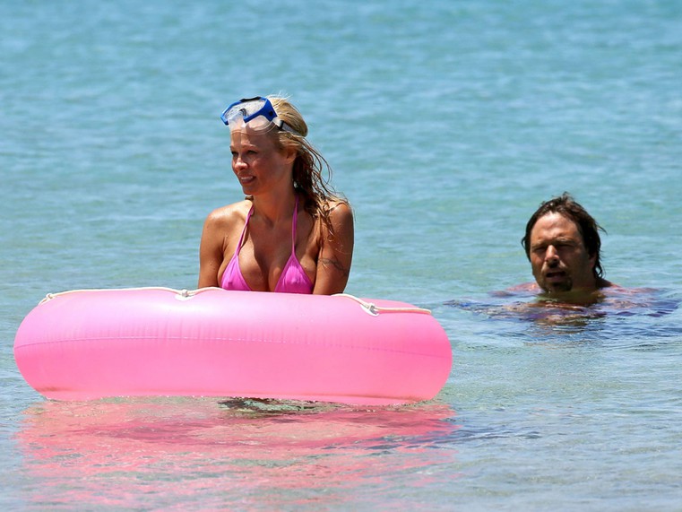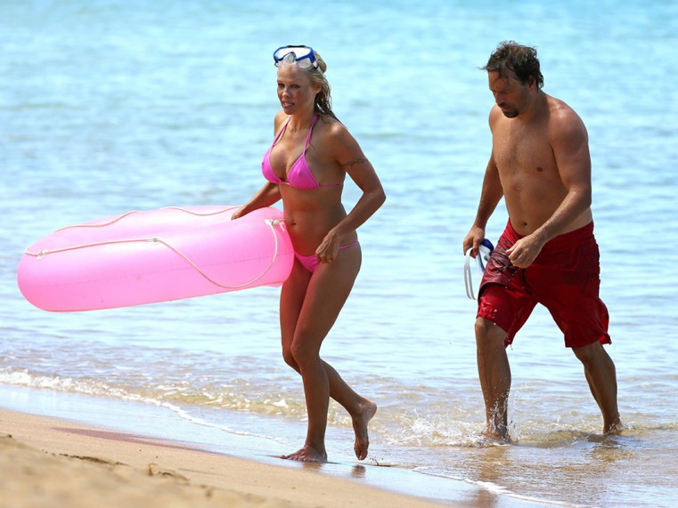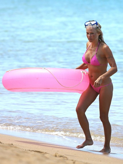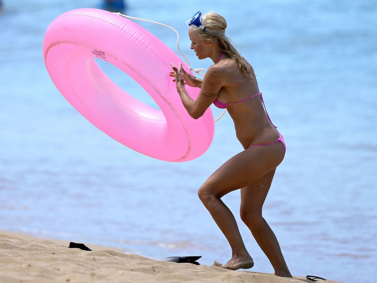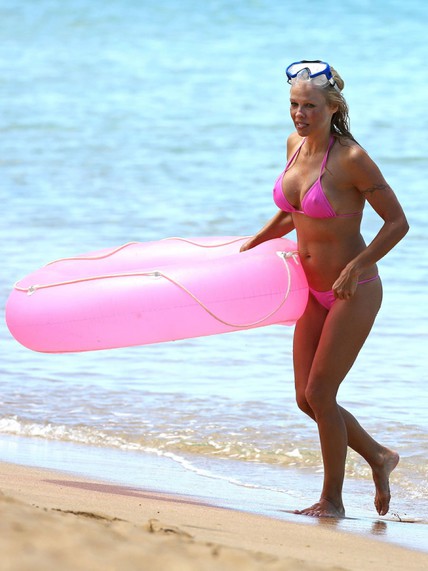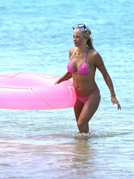 Pamela Anderson tiene 44 años pero luce casi el mismo cuerpo que tenía cuando era la estrella de Baywatch, y presume de él. En sus recientes vacaciones en Hawai fue captada por los paparazzi luciendo un escueto bikini rosa y jugando con un flotador al tono.