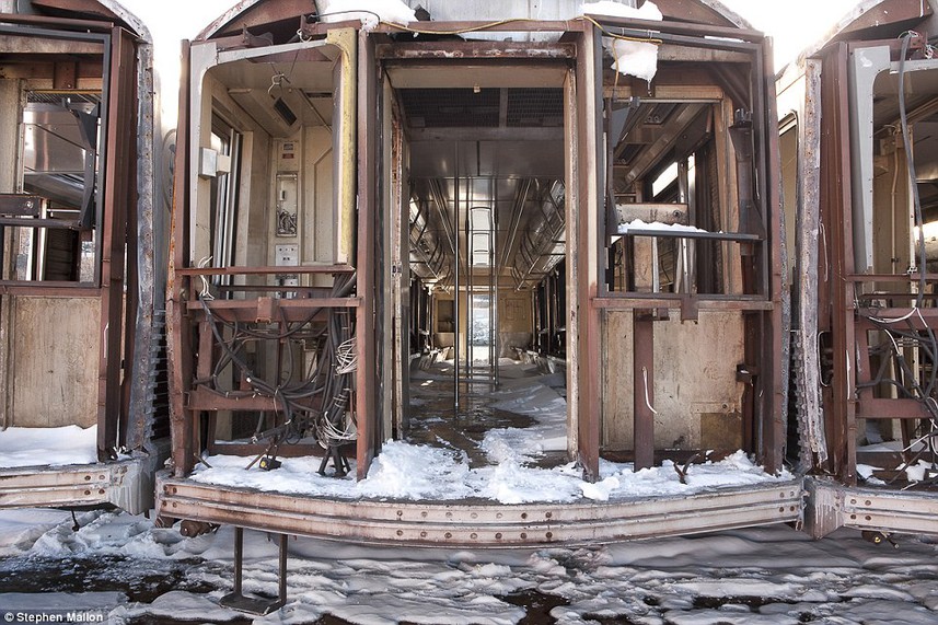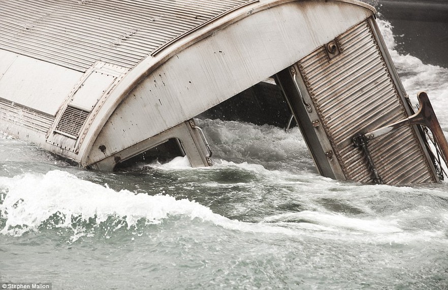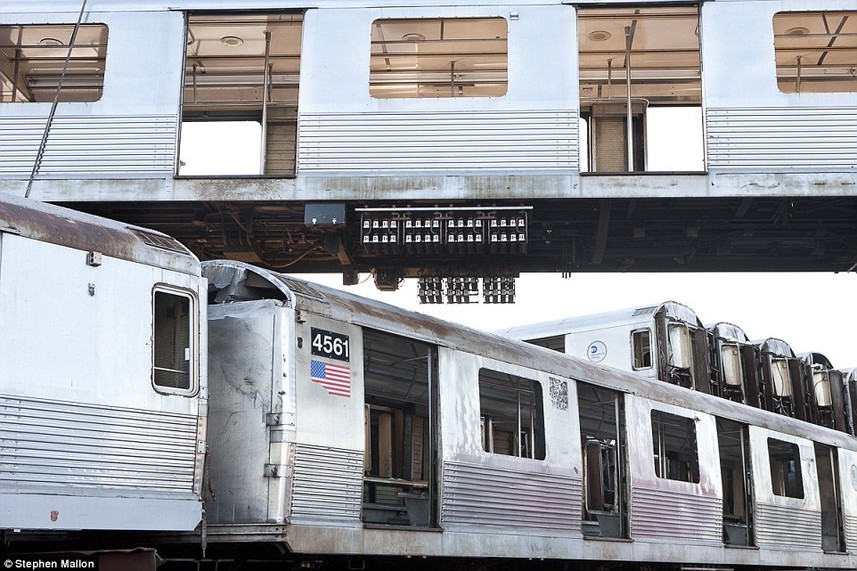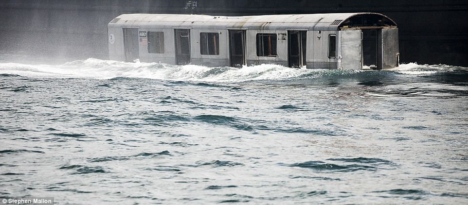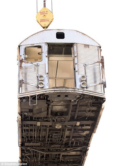 "Ver estos gigantescos coches ser arrojados al mar como si fueran juguetes en la bañera de un niño, es algo que estremece el corazón", afirma el fotógrafo Stephen Mallon, quien se ha ocupado de registrar el último viaje" de los vagones, del metro de Nueva York, una vez que son desafectados del servicio.