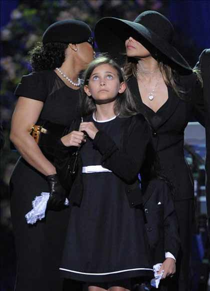 | Las hermanas de Michael Jackson, Janet (i) y La Toya (d), y la hija del artista, Paris (c), participan del funeral y homenaje público a la estrella del pop en el Staples Center de Los Ángeles. EFE |