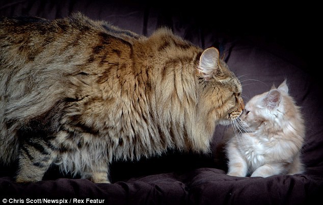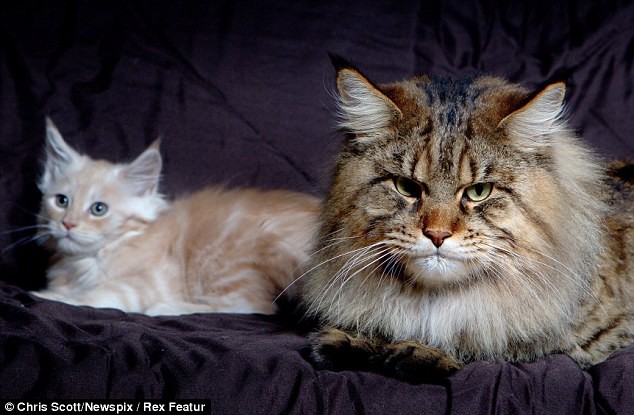 El robusto minino, soberbio ejemplar de la raza Maine Coon, pesa nada menos que nueve kilos, y todavía no alcanzó su madurez, por lo que se espera que crezca todavía un poco más, pudiendo llegar a once kilogramos.