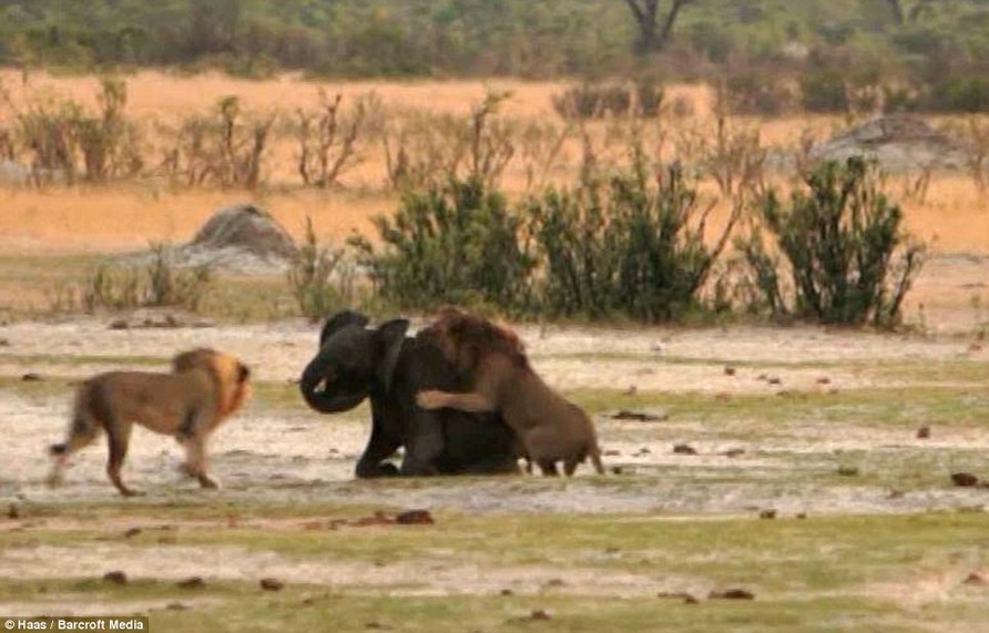 En las imágenes puede verse a un joven elefante, probablemente de entre tres y cuatro años de edad, convertido en presa de un león.