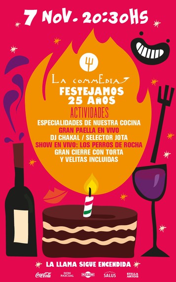 Este jueves 7 de noviembre, a partir de las 20:30 horas, La Commedia Tratoría celebrará 25 años con una paella gigante a la parrilla para compartir con los amigos de siempre. Habrá música, con la selección de DJ Chakal y selector Jota, así como el show en vivo de Los perros de Rocha. Al final, habrá un gran cierre "con torta y velitas incluidas".