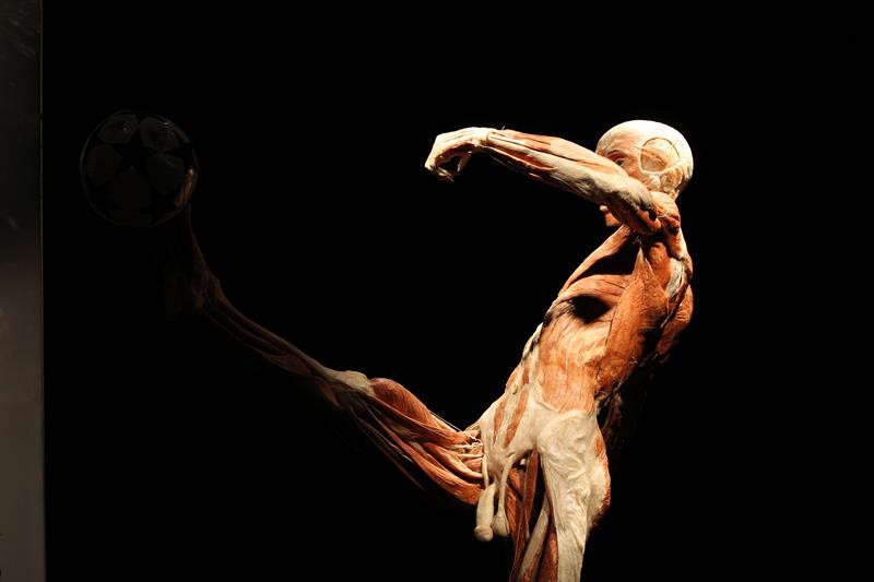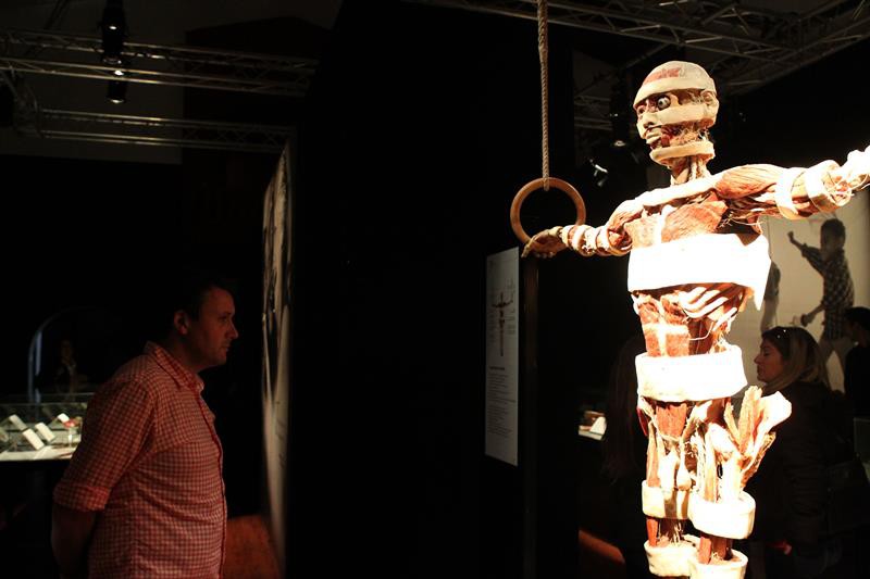 A través de las diversas salas de la exposición se pueden ver cuerpos con sus órganos, músculos y nervios jugando al fútbol, practicando gimnasia artística o esgrima.