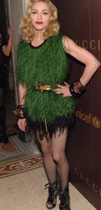 Mal, mal, mal. No hay un solo detalle en este atuendo de Madonna que haya pasado el riguroso test de estilo de los especialistas y críticos de moda. Plumas verdes, zapatos groseramente llamativos, un cinturón dorado... ¿se habrá vestido en un cuarto oscuro?