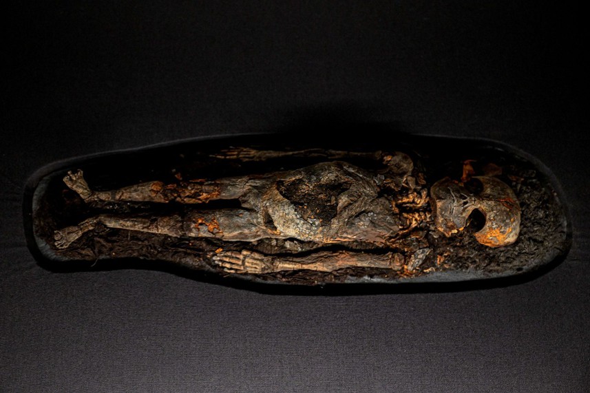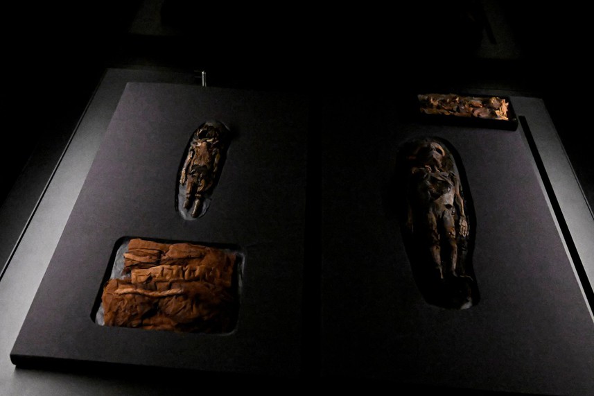 Por primera vez se exhiben también dos fetos momificados, hallados en la tumba real, sobre un pedestal negro.