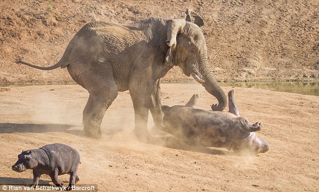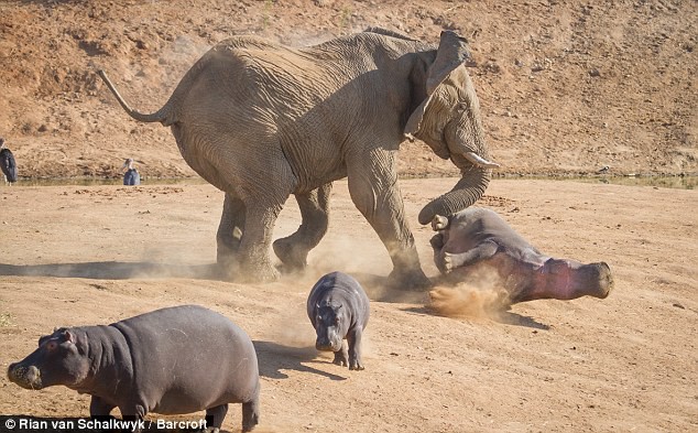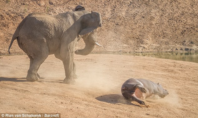 "Cayó de espaldas y rodó hasta el agua", relata el fotógrafo. "Después, el elefante se quedó en la orilla unos cinco minutos, muy enojado. La hembra y otros hipopótamos permanecieron en el agua hasta que se marchó".