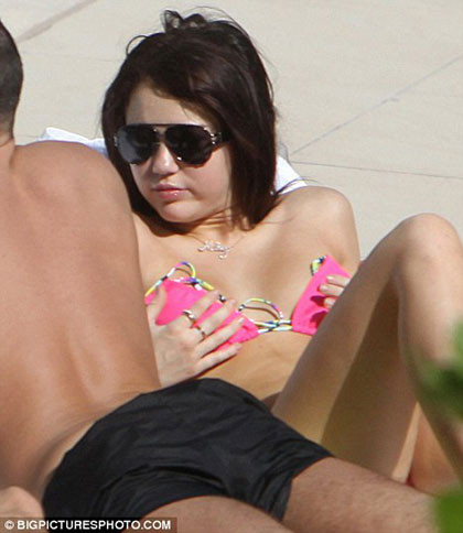 Miley fue fotografiada por paparazzi mientras descansaba en un hotel de Miami Beach, donde se paseó con un pequeño bikini color rosa que en ocasiones desprendía para broncearse sin marcas.