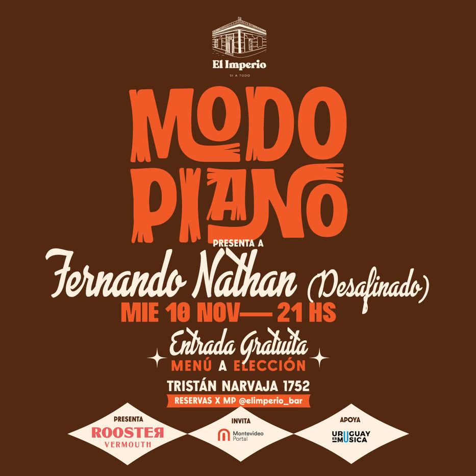 Modo Piano es con entrada libre y gratuita, previa reserva a través de la cuenta en Instagram de El Imperio Bar. La capacidad es muy limitada. El ciclo es presentado por Vermouth Rooster, cultura de aperitivo, y cuenta con el apoyo de Uruguay es Música y Montevideo Portal.