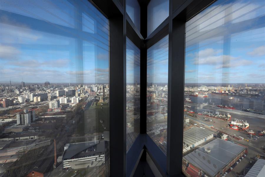 Su peculiar forma juega con la vista que se aprecia desde los 126 metros del piso 26, ya que desde algunas zonas del edificio parece que el visitante está en la angosta proa de un barco y otras en una amplia popa.