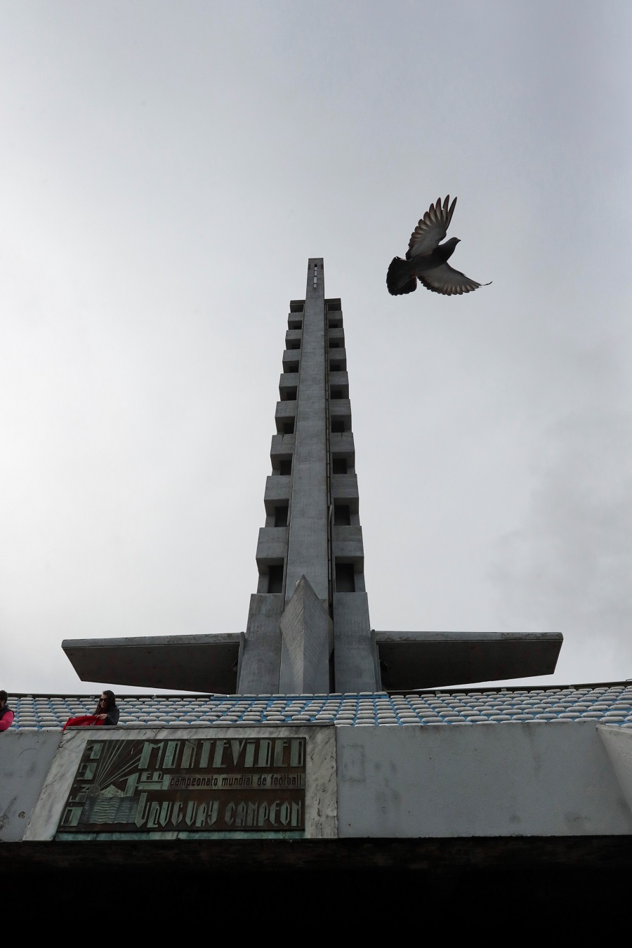 El verde del Estadio Centenario contrasta con el gris y blanco de los edificios y el azul del río de la Plata desde lo alto de los cien metros de la Torre de los Homenajes.