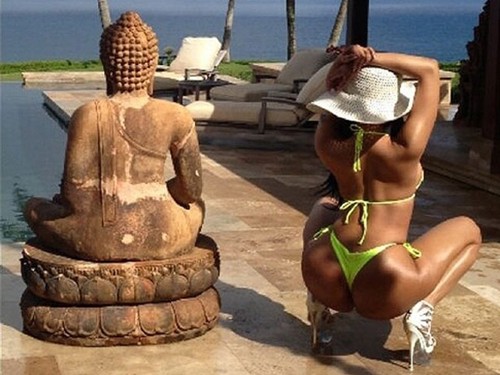 La artista compartió en su cuenta de Twitter unas fotos que se tomó en una producción en la que lucía unos altísimos tacones y un bikini amarillo flúo muy revelador.
