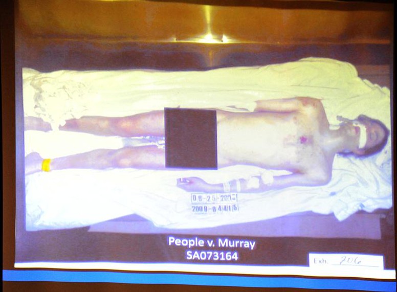 Las instantáneas pertenecen al informe del forense, Christopher Rogers, que le practicó la autopsia y son una prueba de la Fiscalía para intentar probar que Jackson no pudo inyectarse a sí mismo el anestésico propofol que le condujo a su muerte, argumento que mantiene la defensa de Murray, reportó Europa Press.