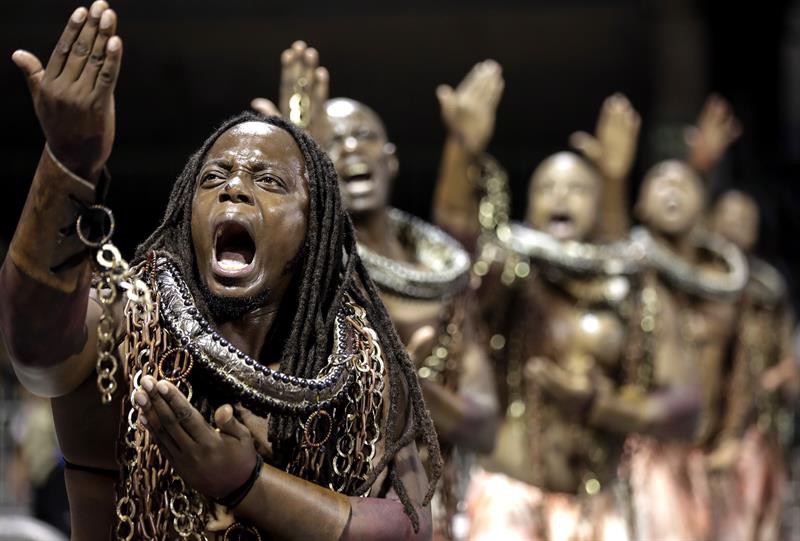 Así como la noche anterior, la temática negra también estuvo muy presente en los desfiles de la madrugada de este domingo, cuya apertura estuvo a cargo de la escuela de samba "Águias de Ouro", que rescató la historia de la colonización de Brasil y todos los males que aquejan al país desde entonces.