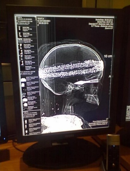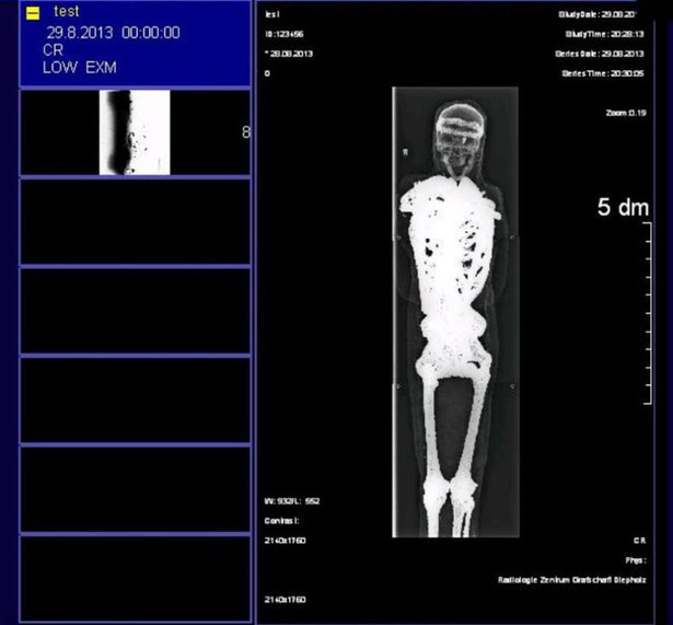 Una tomografía computarizada reveló que está muy bien preservado el cráneo humano, con una flecha que sale de la cuenca del ojo izquierdo, así como varias partes de un esqueleto que reposa con los brazos cruzados sobre el pecho, indicó el diario local Kreiszeitung.