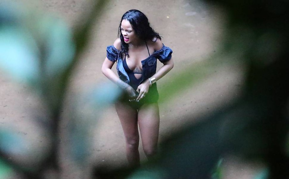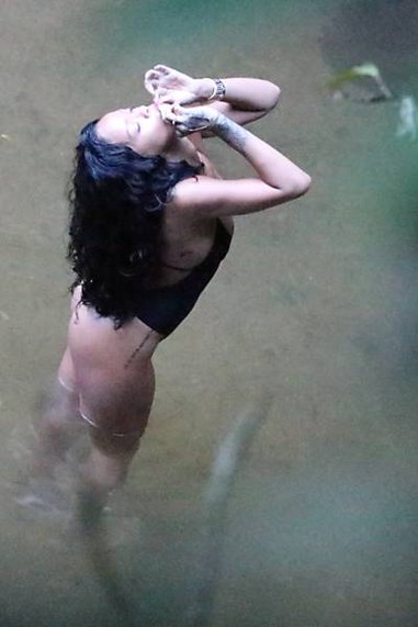 Los paparazzi localizaron a Rihanna bañándose en la carioca cascada de Horta, luciendo un traje de baño monopieza muy cavado en la baja espalda. Según consigna el periódico Folha, la cantante permaneció en el lugar unos 45 minutos, tiempo que aprovecho para, bañarse, relajarse y dar unas pitadas.