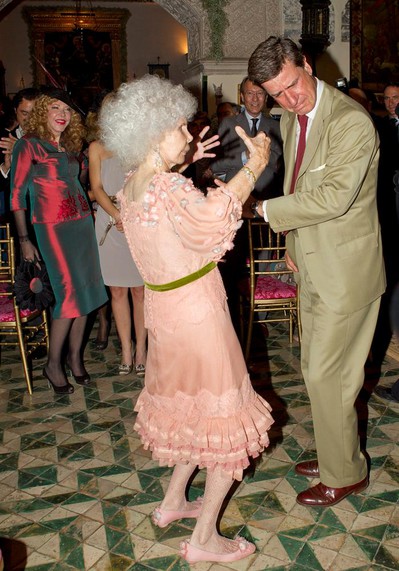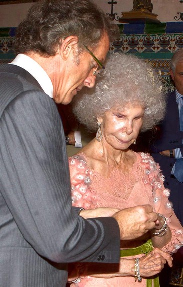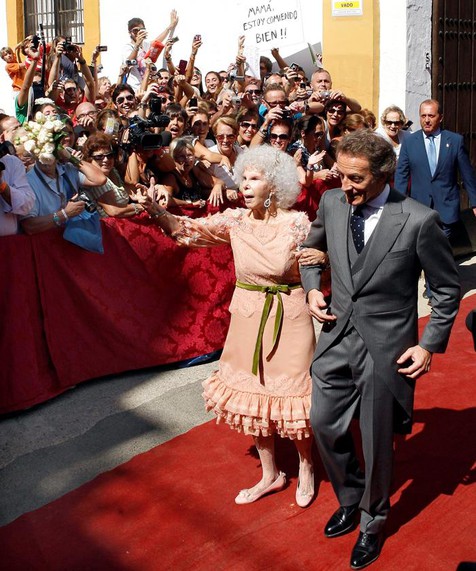 La duquesa de Alba, Cayetana Fitz-James Stuart, y su esposo y duque consorte, Alfonso Díez, han salido tras su boda a las puertas del Palacio de las Dueñas de Sevilla para saludar al numeroso público allí congregado, momento en el que la duquesa ha bailado descalza al son de unas sevillanas.
