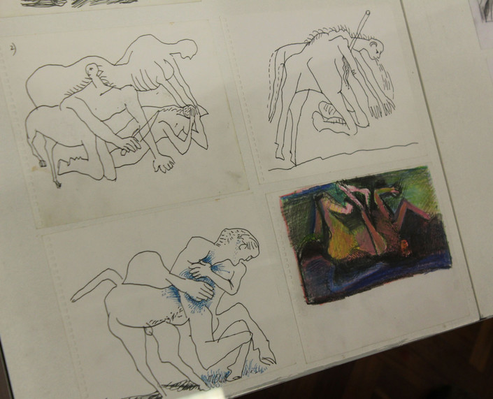 Por su parte, la ingeniera Ida Holz, viuda del artista, contó que la serie de Centauros surgió a raíz de una caricatura de Peloduro que mostraba la represión policial a caballo y hablaba de "mitad bestia, y mitad también".