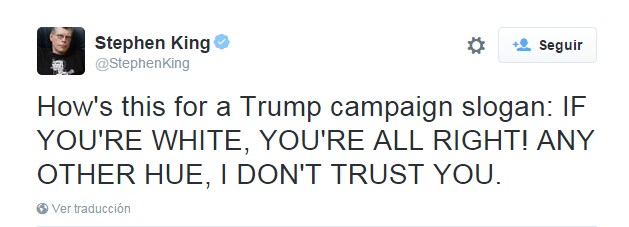 El escritor Stephen King criticó al aspirante a la nominación del Partido Republicano para la presidencia de Estados Unidos, Donald Trump, infiriendo que el magnate estadounidense está llevando a cabo una campaña basada en el racismo.