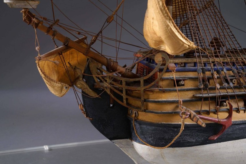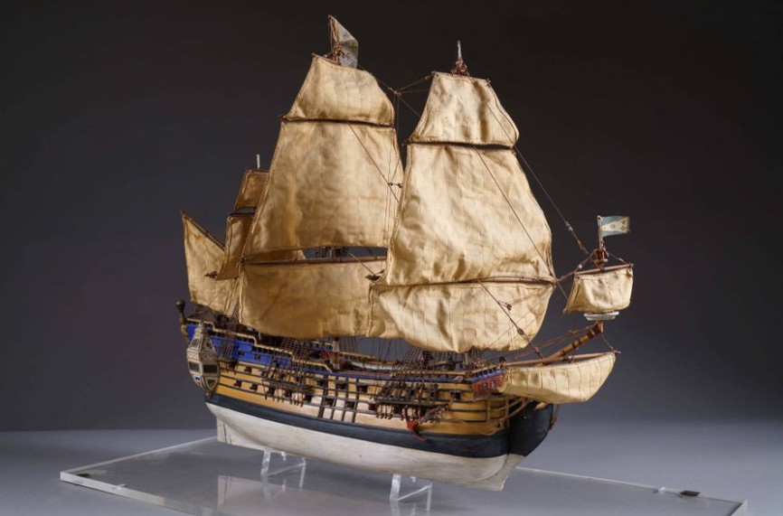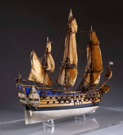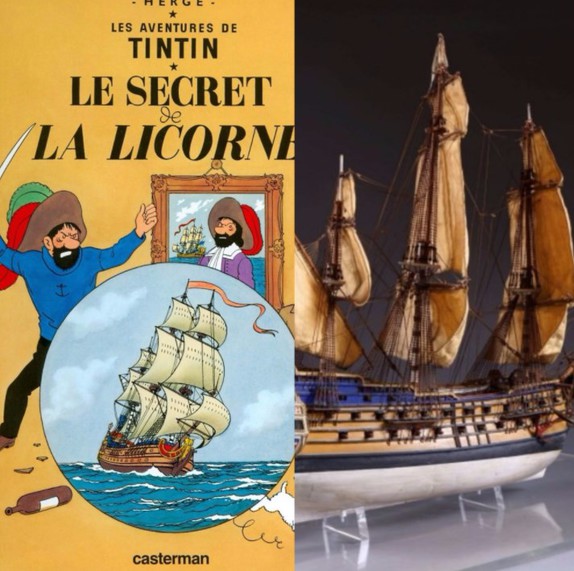 El modelo (tres mástiles, cincuenta cañones, 55 centímetros de proa a popa, velas de lino y una capa de polvo que muestra su edad) fue construido en 1942 por encargo de Hergé, creador del célebre personaje Tintín. El artista necesitaba el modelo para dibujar escenas navales de su álbum "El secreto del Unicornio", que debía salir a la venta el año siguiente.