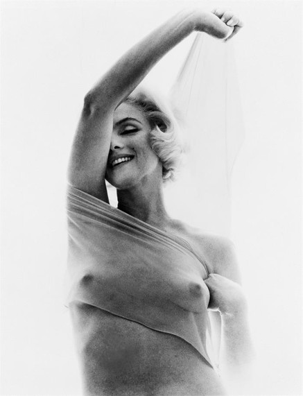 Y lo consiguió: desnuda y juguetona, Monroe se esconde detrás de un fular transparente o apenas se tapa con dos telas a través de las que se traslucen sus pechos.