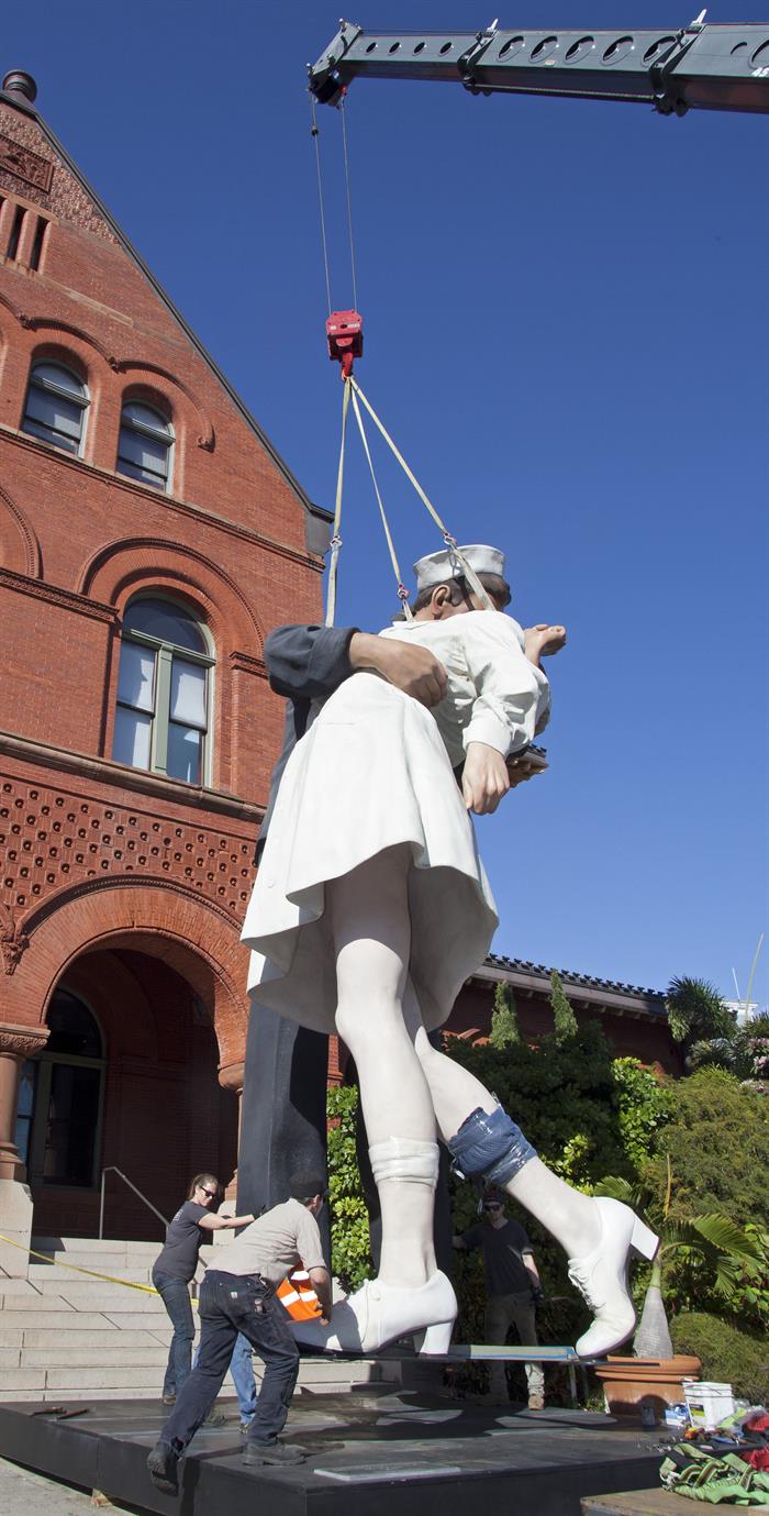 "Embracing Peace", de 7,6 metros de alto y más de 6.800 kilos de peso), está inspirada en la fotografía en la que se ve a un marinero y una enfermera besándose en Nueva York tras conocer el fin de la II Guerra Mundial (1945).